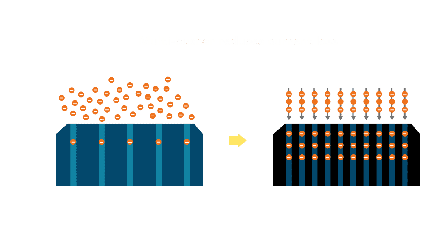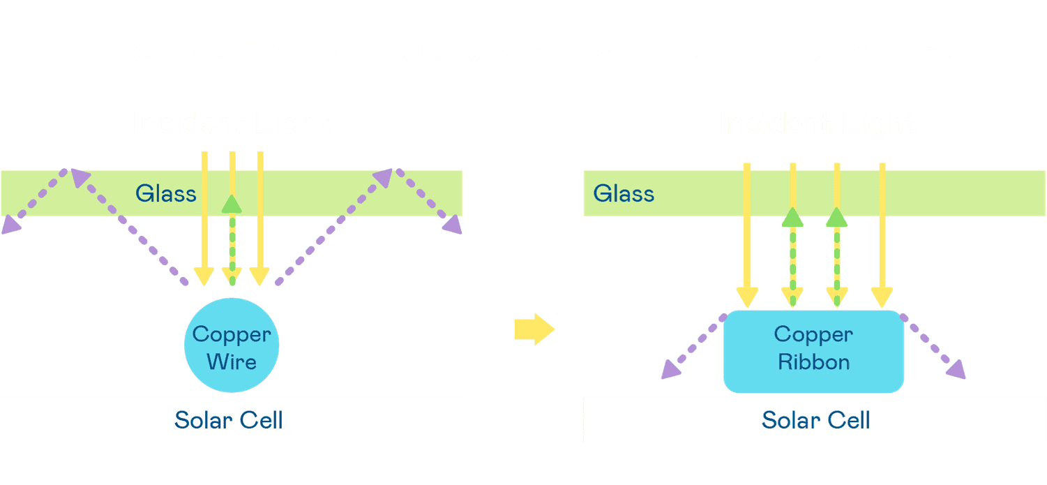 • 电池使用多条铜导线 (Copper wire) 于电池片上形成较短的电流路径,,提高电流收集效率,,,,采用圆形设计的铜导线较传统扁平式的铜焊带 (Ribbon),,,可增加入射至电池的光线量。。。