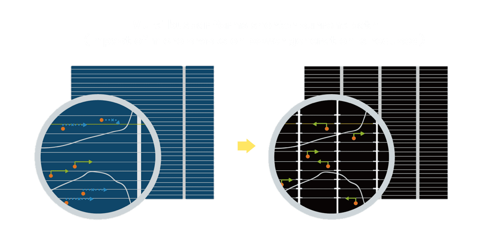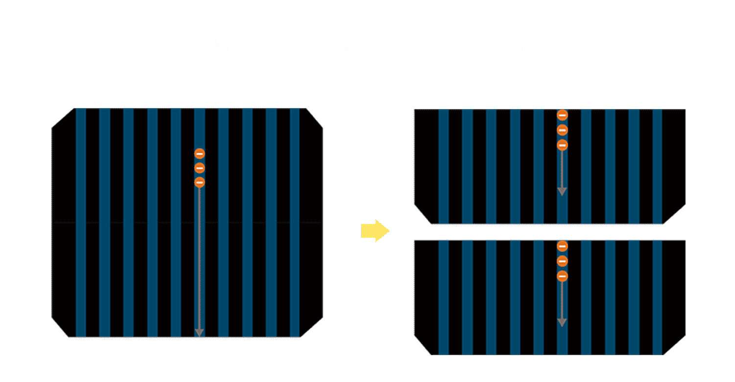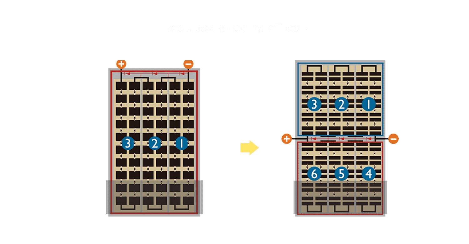 • 结合半切电池,,,,降低遮阴影响、、、提升模组抗隐裂能力、、并减少电阻损耗,,,,进一步提升模组发电效能。。。。